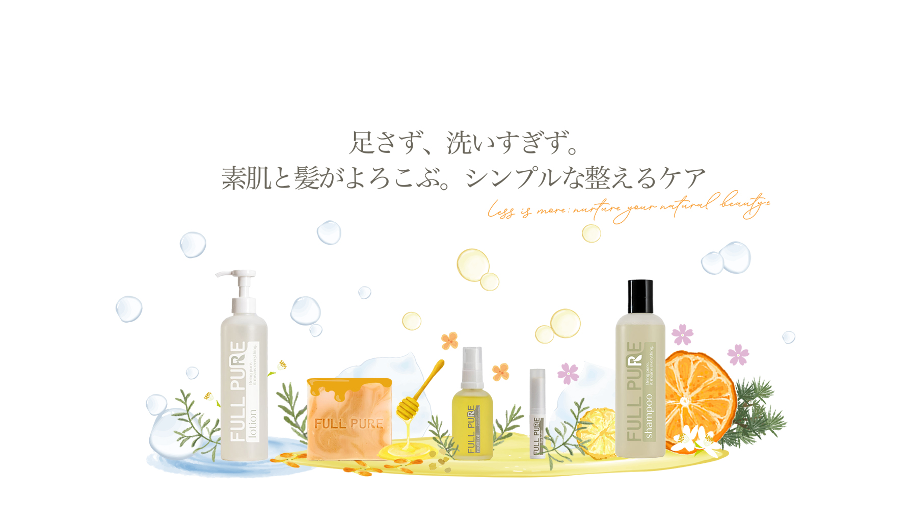 毎日、肌に気を遣うように、髪や頭皮にももっとやさしさを。そんな想いから生まれたフルピュアは、スキンケアとヘアケアを同じ目線で考えるブランドです。